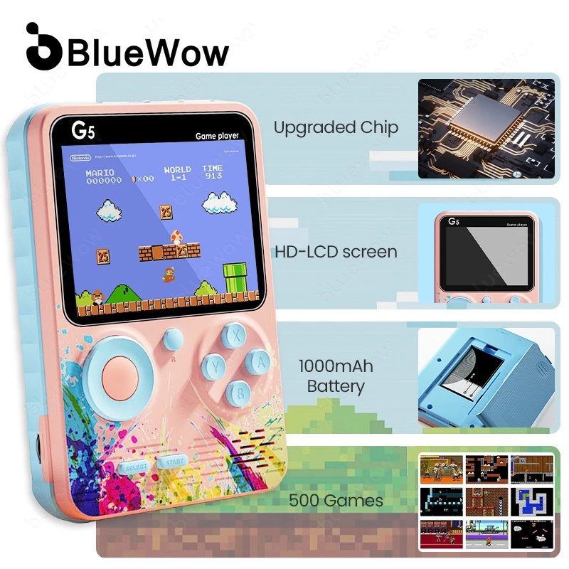 BlueWow G5 คอนโซลมือถือแบบพกพา Retro Mini กระเป๋าเกม 2Player Sup กล่องเกม 500 ใน 1 Gameboy Gamebox ชาร์จ